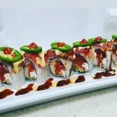 Shrimp tempura, spicy tuna, cream cheese, cucumber topped with seared tuna, jalapeño, spicy mayo, eel sauce and sriracha