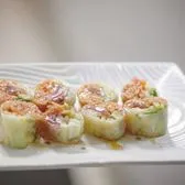 (No rice) Smoked salmon, spicy crab. cream cheese, avocado rolled in cucumber sheet with ponzu and garlic oil