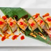 Seared tuna, shrimp tempura, avocado topped with salmon, fresh shrimp, spicy mayo, eel sauce, tobiko, masago and tempura flake