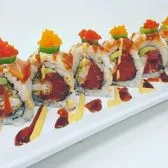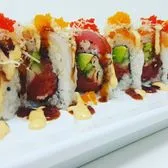 Shrimp tempura, eel, avocado, cucumber topped with fresh tuna, spicy mayo, eel sauce, tempura flakes and tobiko