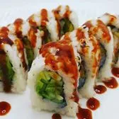 Avocado, soft shell crab, cucumber, masago with rice inside & topped with spicy mayo & eel sauce