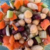 Garbanzo, Cannelinni, and Kidney Beans | Celery | Carrots | Onion | White Wine Vinegar | EVOO | Basil | Honey | Sea Salt | Pepper
