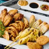 2 Thai crispy spring rolls, 2 chicken satay, 4 Thai spiced wings, 2 corn patties, 6 fried chicken dumplings, served with assorted sauces.