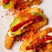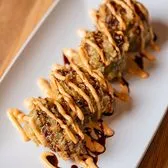 Tempura shrimp topped with cream cheese, avocado and spicy sauce.