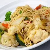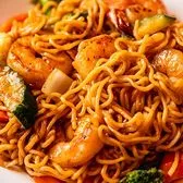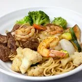 Stir fried noodles with mixed vegetables shrimp and beef.