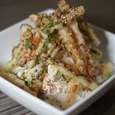 Sushi rice bowl with tempura veggies, sesame seeds, unagui sauce, kanikama salad and tornado dressing.