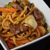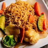 Pan-fried vegetables, carrot, onion, serrano pepper, edamame, shiitake, shichimi pepper, and teriyaki sauce with udon noodles.