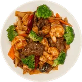 Shrimp, chicken, beef and mixed veggies. We're just one big Happy Family! Shrimp, Chicken, and Beef with mix veggies (broccoli, carrot, bamboo-shoot, baby-corn, button mushroom in a savory spicy brown sauce).