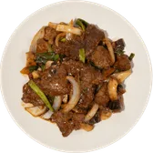 Tender steak, bell peppers, mushrooms, onions, and green onions stir fried in a peppery brown sauce.