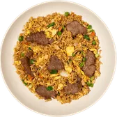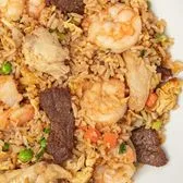 Shrimp, beef, & chicken stir fried w/ rice, Vital Farms eggs, peas, carrots, onions, green onions