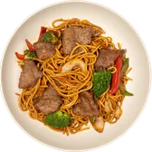 Tender steak & egg noodles stir-fried in a brown sauce with bell peppers, onions, celery, broccoli & carrots