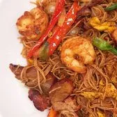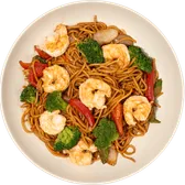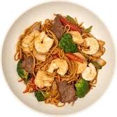 Tender beef, chicken, and shrimp stir-fried with egg noodles & veggies