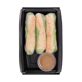 Cooked roll. All natural shrimp, rice noodle, imitation crab, lettuce, and cilantro rolled in a rice wrapper. Served with peanut sauce.
