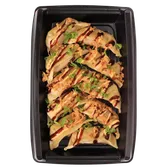 Pan-fried dumplings are filled with chicken, cabbage, onion and seasoning. For the finishing touch, they're topped with sushi sauce, spicy mayo, crunchy onion flakes and fresh green onion. Just give them a quick warm-up in the microwave and dig into this nacho-style, yet Asian-inspired appetizer.