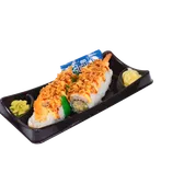 Cooked roll. Filled with tempura shrimp and imitation crab, this roll is topped with spicy mayo, sushi sauce, and sesame seeds. Served alongside traditional wasabi, pickled ginger, and soy sauce.