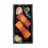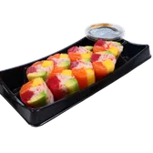 From H-E-B Sushiya, this Rainbow sushi roll is as colorful as it is flavorful. Beautifully topped with sliced tuna, salmon and avocado, it has imitation crabmeat and cucumber inside the roll of sushi rice. Use the included wasabi, ginger and soy sauce to customize each bite.