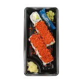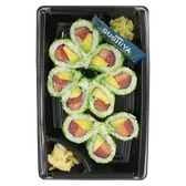 Raw roll. Rolled with salmon, tuna, and avocado, and topped with wasabi tobiko for a nice kick of wasabi. Served alongside traditional wasabi, pickled ginger, and soy sauce.