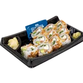 Cooked roll. Rolled with imitation crab salad and cucumber and topped with imitation crab, spicy mayo, sushi sauce, and fried onions. Served alongside traditional wasabi, pickled ginger, and soy sauce.