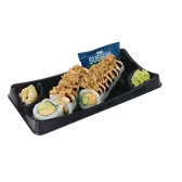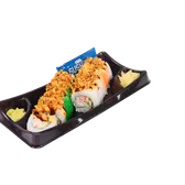 Cooked roll. A crunchy twist on the classic California roll, rolled with imitation crab, cucumber, avocado and topped with onion flakes. Served alongside traditional wasabi, pickled ginger, and soy sauce.