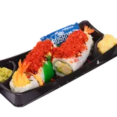 Cooked roll. Classic sushi roll, rolled with avocado, imitation crab, and cucumber topped with spicy mayo & sesame seeds. Served with soy sauce, pickled ginger, and spicy wasabi.