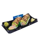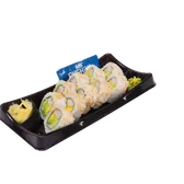 Cooked roll. Filled with spicy imitation crab, topped with sliced avocado, sushi sauce and spicy mayo. Served alongside traditional wasabi, pickled ginger, and soy sauce.