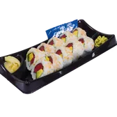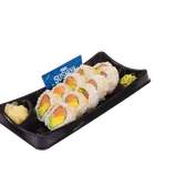 Cooked roll. 15 pieces of a classic sushi roll, rolled with avocado, imitation crab, and cucumber topped with sesame seeds. Served with soy sauce, pickled ginger, and spicy wasabi.