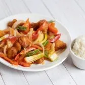 Deep fried breaded chicken or a protein of your choice, bell pepper, onion, green onion, tomato, pineapple, and cucumber cooked in pineapple and tomato sauce