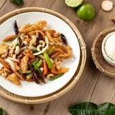 Breaded protein stir-fried with onions, carrots, bell peppers, dried chili, and cashew nuts in house brown sauce