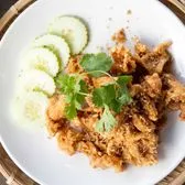 Fried chicken or protein of choice stir-fried with garlic in our house brown sauce served with cucumbers relish and topped with cilantro.