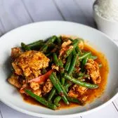 Stir fried protein with chili-garlic sauce, green beans, bell pepper, and basil
