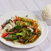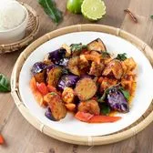 Tofu or your choice of protein, purple eggplant, garlic, basil and bell pepper sautéed in house brown sauce