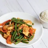 Protein stir-fried in a spicy and herbal prik khing curry paste, green beans, and bell peppers
