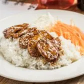 Grilled protein topped with teriyaki sauce on a bed of rice with toasted sesame seeds, preserved cabbage, and carrot on the side
