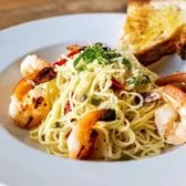 Angel hair tossed in lemon zest and olive oil with capers, sun-dried tomatoes, Parmesan and basil. Served with your choice of grilled chicken or shrimp and garlic toast