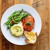 Homemade meatloaf served with French green beans, whipped potatoes with poblano mushroom cream sauce and garlic toast