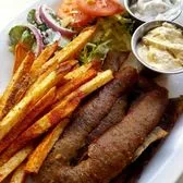 Slices of seasoned lamb and beef, tzatziki, jalapeño hummus, lettuce, tomato and onion. Served with hand-cut fries and pita