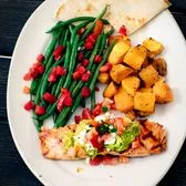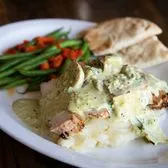 Grilled salmon topped with feta, guacamole and chopped tomato. Served with French green beans, butternut squash and pita