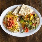 Skewers of beef tenderloin, grilled chicken or a combination. Served with herb basmati rice, roasted vegetables, and pita
