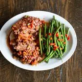 Roasted beef braised in red wine with carrots and tomato puree over whipped mashed potatoes. Topped with fried onions and served with French green beans and garlic toast