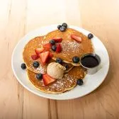 3 pancakes, fresh berries, maple syrup, cinnamon butter add blueberry, chocolate chips, granola $1