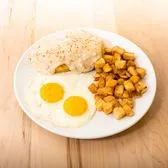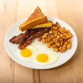 2 eggs, bacon or sausage, breakfast potatoes, choice of toast.