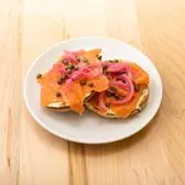daily bagel selection, smoked salmon, dill cream cheese, capers, pickled onions