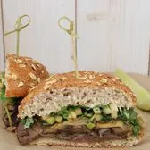 grilled steak, caramelized onion, fontina, arugula, apple, mushroom, horseradish crème, soy sauce, house bun