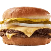Two steakburger patties, cheese, mustard, onion & pickle on a toasted bun.