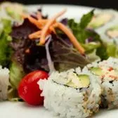 Krab† mix, cucumber and avocado rolled in seaweed and rice. Served with miso soup and uchi no salad.