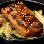 Grilled salmon served over rice with sauteed zucchini, mushrooms, and onions, topped with teriyaki sauce