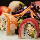 The classic †California Roll topped with tuna, yellowtail, shrimp, salmon and avocado to look like a rainbow. Served with miso soup and uchi no salad.