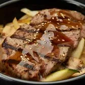 Grilled steak served over rice with sauteed zucchini, mushrooms, and onions, topped with teriyaki sauce