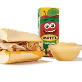 Oven-roasted turkey and aged cheddar cheese served warm on French Parisian bread with choice of fruit (45 cal), applesauce (40 cal) or bag of chips (140-300 cal). For kids 12 and under. For kids 12 and under. Includes kid’s fountain beverage (0-170 cal), or apple juice (100 cal).