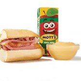 Ham and aged cheddar cheese served warm on French Parisian bread with choice of fruit (45 cal), applesauce (40 cal) or bag of chips (140-300 cal). For kids 12 and under. Includes kid’s fountain beverage (0-170 cal), or apple juice (100 cal).
